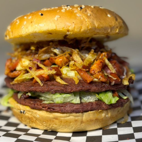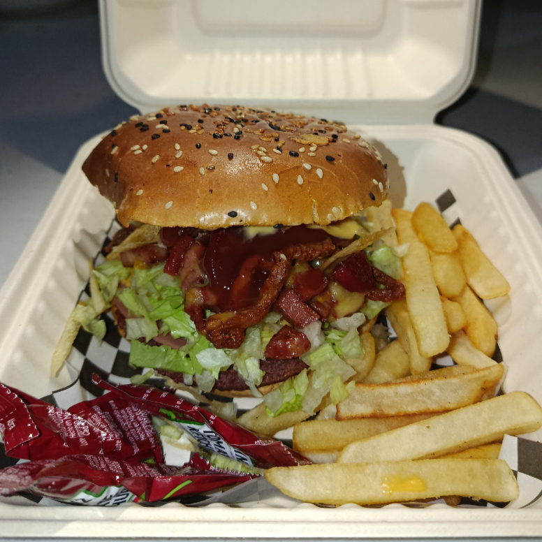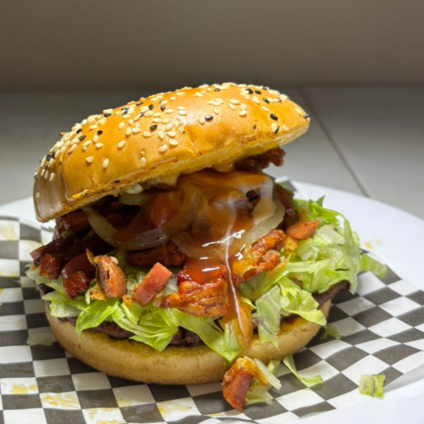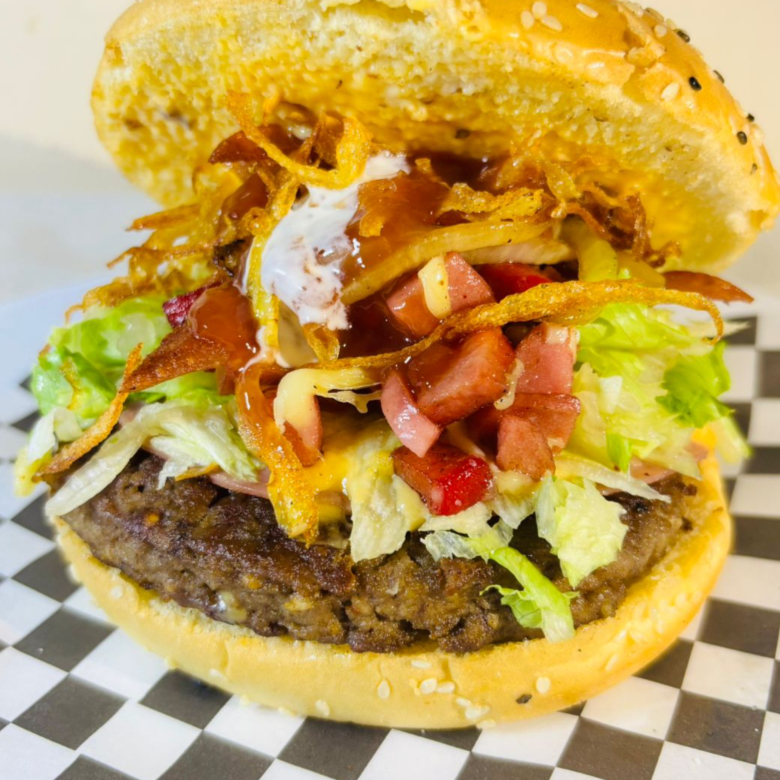 Pan ajonjolí, doble carne de res, lechuga, jamón, doble queso, mayonesa, cátsup, ranch, salchicha para asar, carne pastor, tomate, cebolla caramelizada y papas ralladas