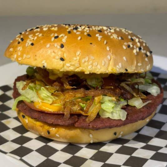 Pan ajonjolí, carne de res, lechuga, jamón, queso, tomate, cebolla caramelizada y papas ralladas