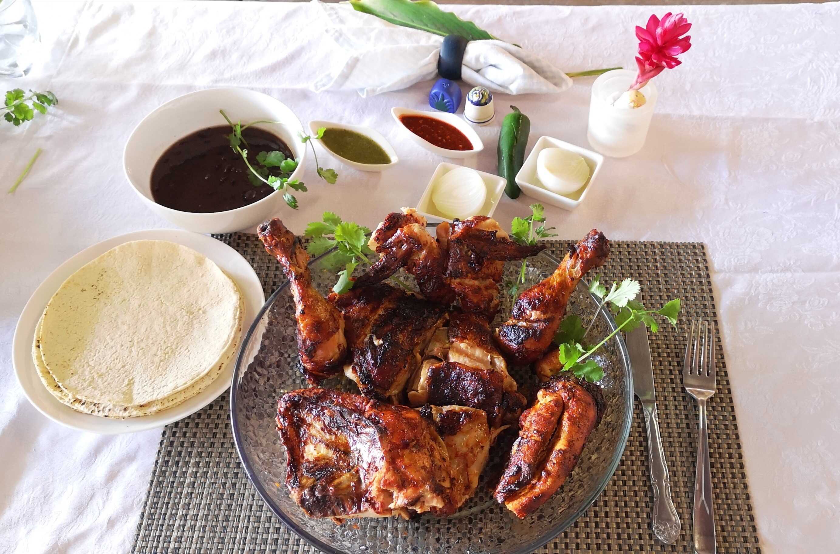 1 Pollo 1/2 , 1-Orden de papa, 1 Complemento, 1 Orden de tortilla(5), chile jalapeño