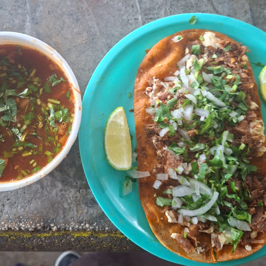1/2 de consome con carne,tortillas de maiz, carne de res cebolla y cilantro