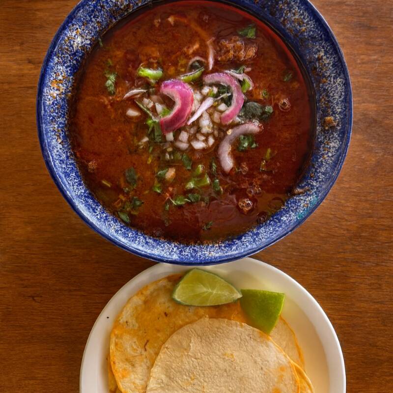 1 Litro de consome con carne,tortillas de maiz,cebolla y cilantro