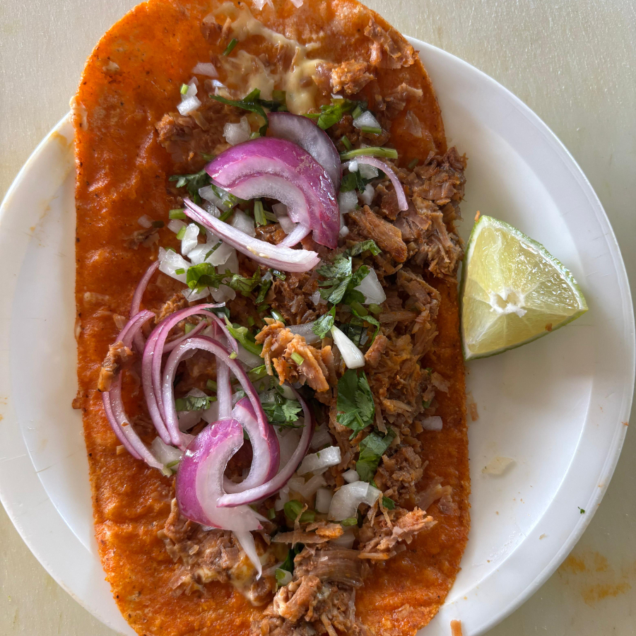 Tortilla de maiz de 20 cm de largo, carne de res, queso chihuahua,cebolla y cilantro
