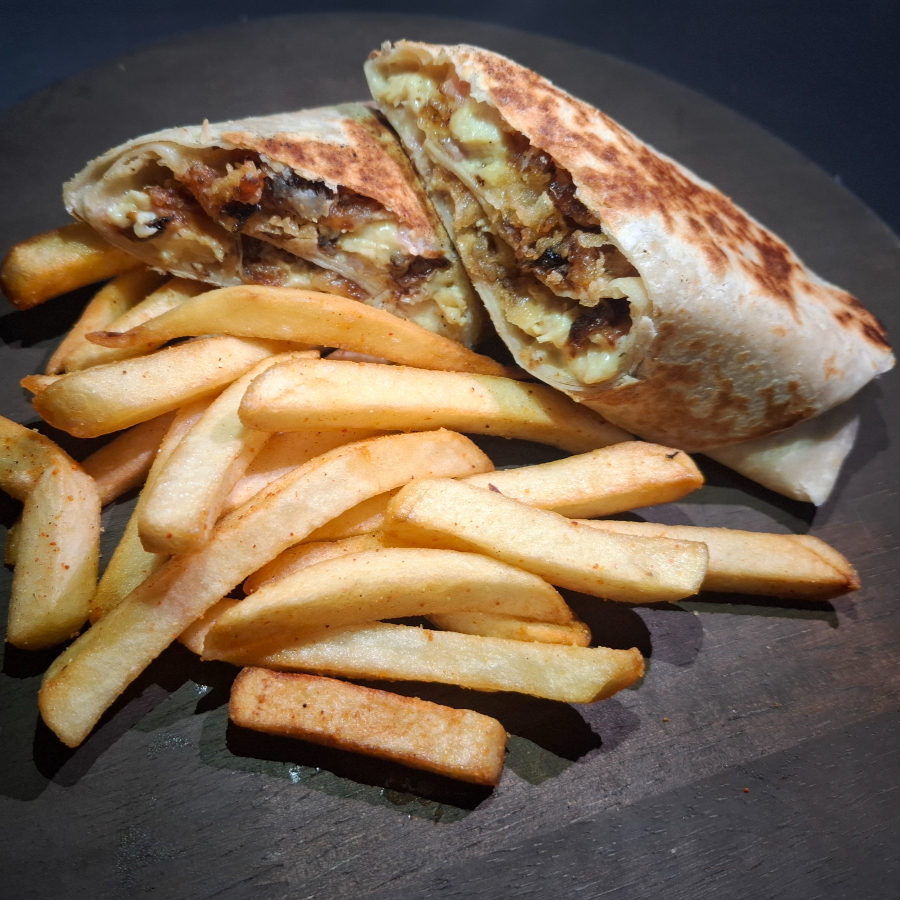 Tortilla de harina, pechuga de pollo, queso mozzarella, cebolla crispy, aderezo de la casa y papas a la francesa