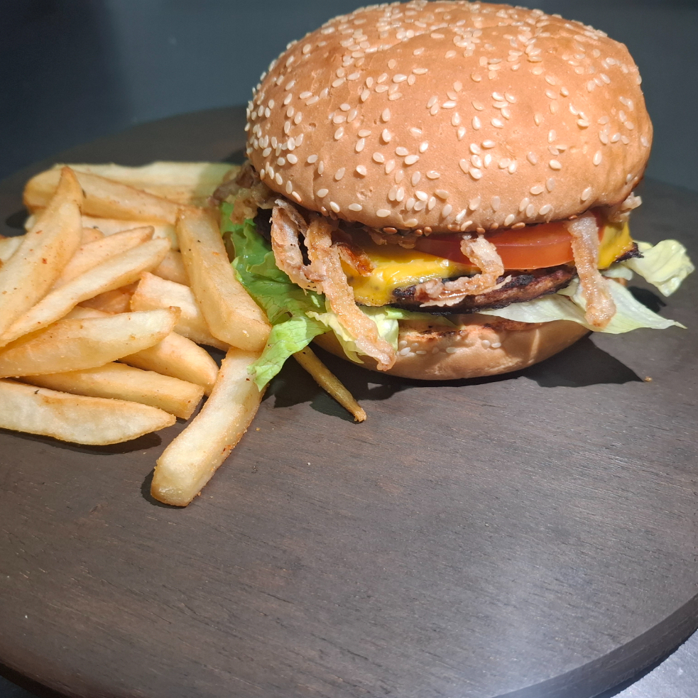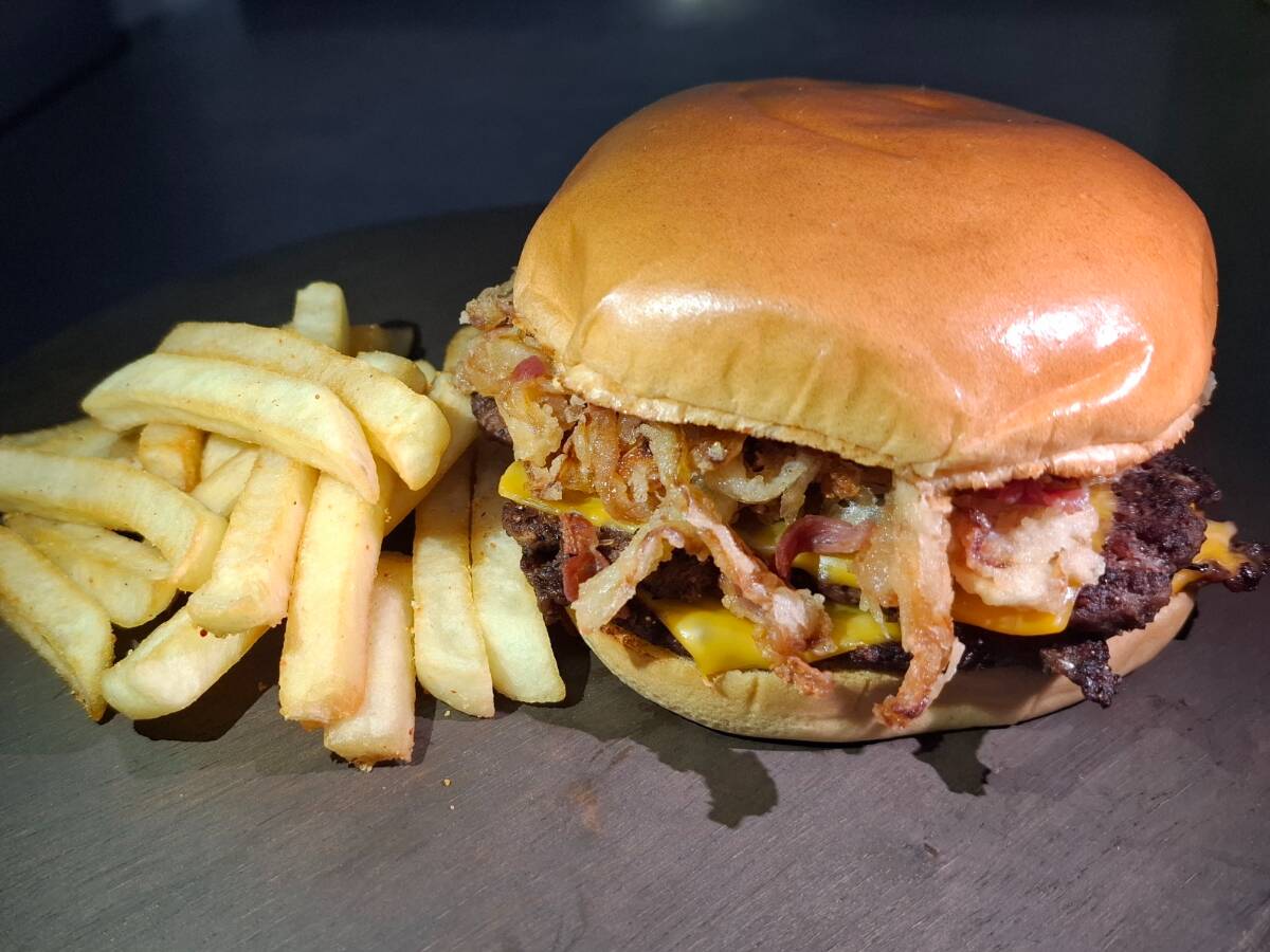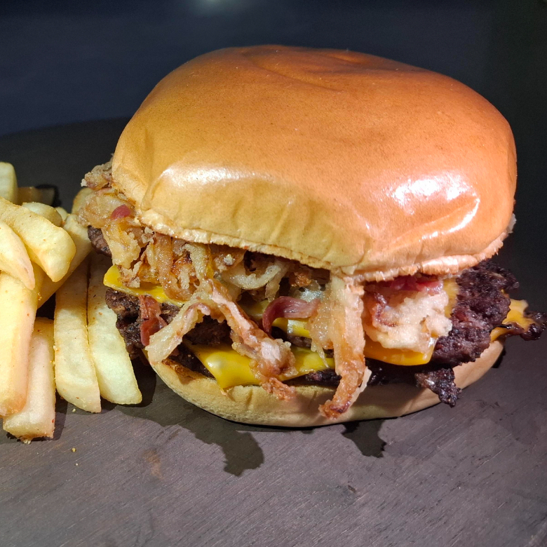 Pan brioche, doble medallón smash, cheddar x 2, cebolla crispy, tocino, salsa mil islas y papas a la francesa.