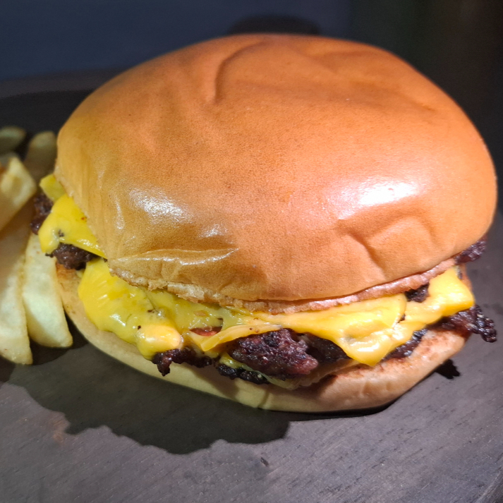 Pan brioche, doble medallón smash, cheddar x 4, salsa mil islas y papas a la francesa.