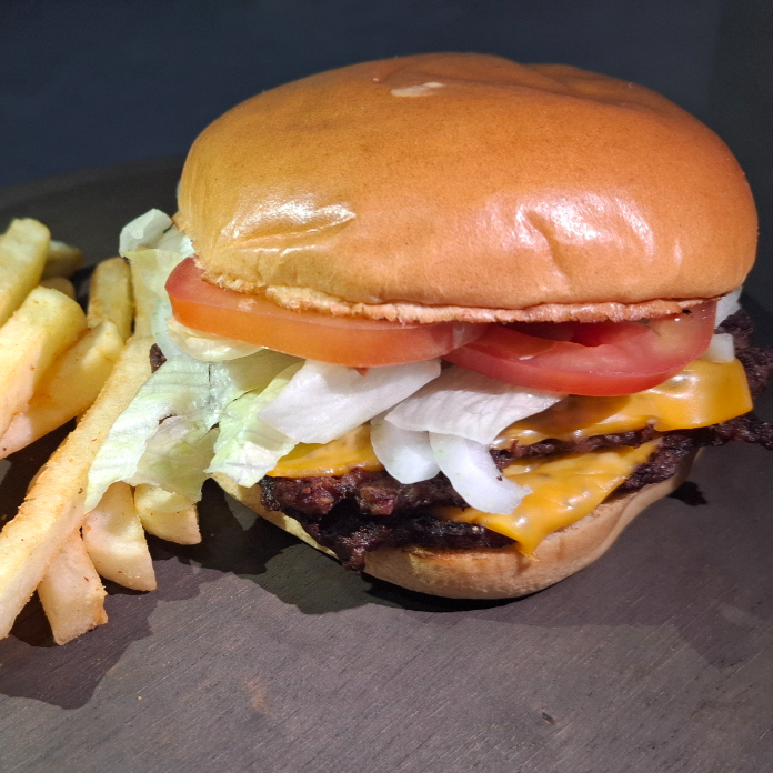 Pan brioche, doble medallón smash, cheddar x 2, tomate, lechuga, cebolla, salsa mil islas y papas a la francesa.