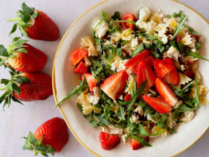 Mix personal , de lechugas, pasta, manzana, fresas, queso panela, arándanos, pechuga de pollo asada, asada, aderezo a elegir. + agua embotellada de 500ml