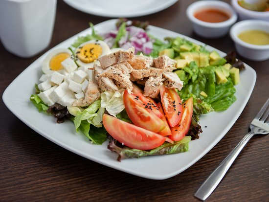 Mix de lechugas, pasta, huevo cocido, queso panela, aguacate, jamón de pavo, pechuga de pollo asada, aderezo a elegir. + agua embotellada de 500ml