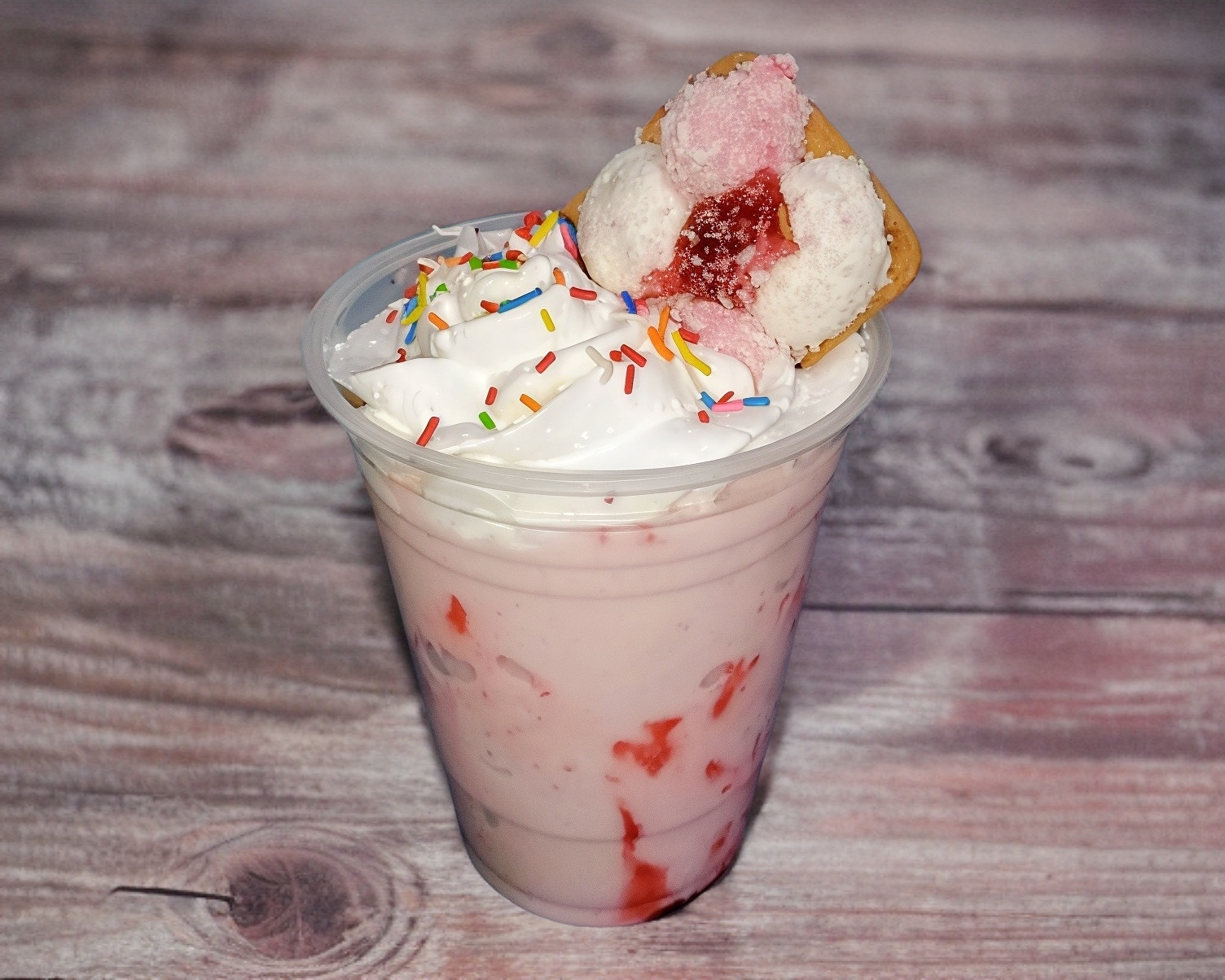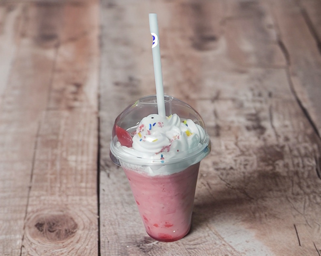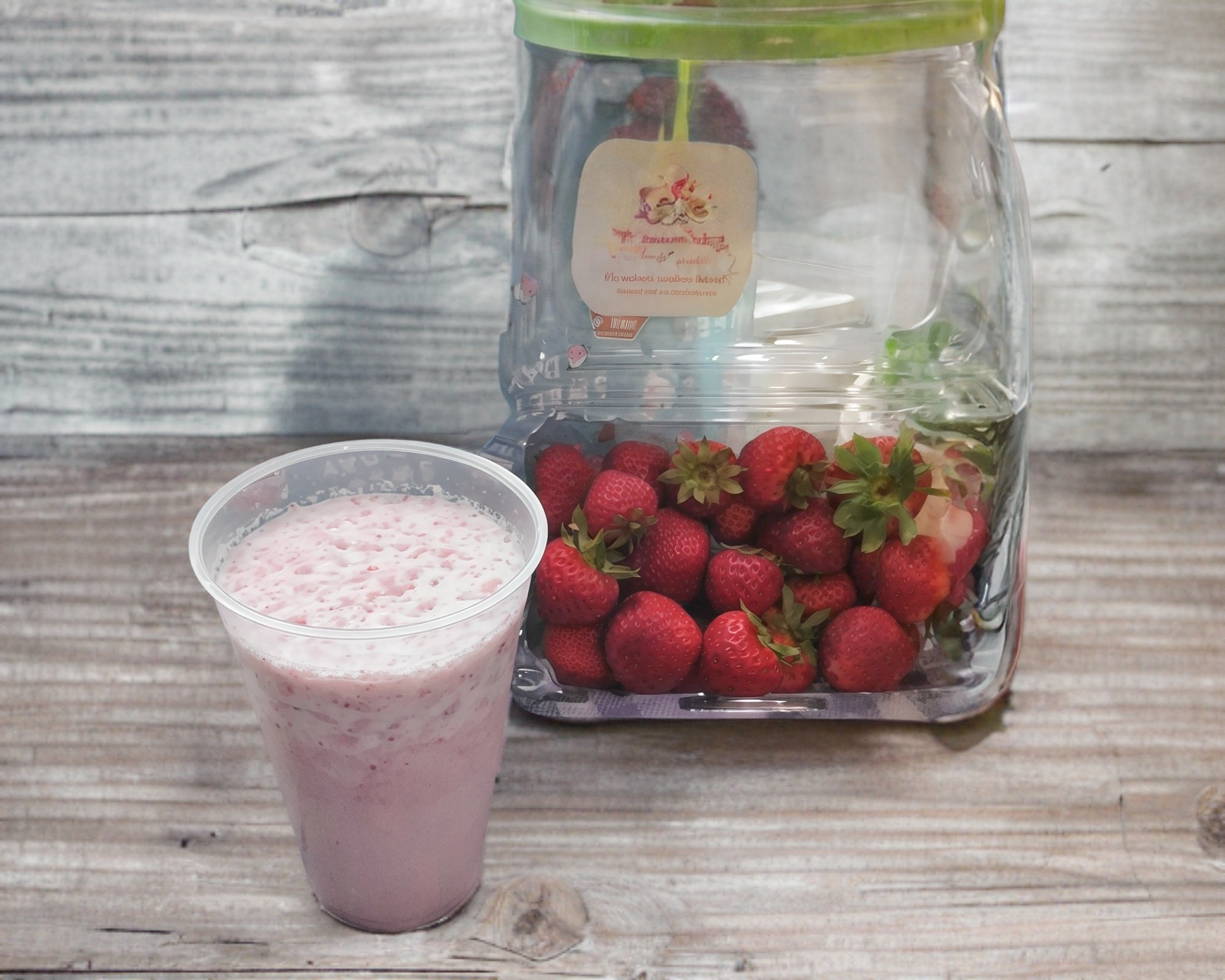 Leche deslactosada, fresas naturales, hielo, azucar. Vaso 16oz