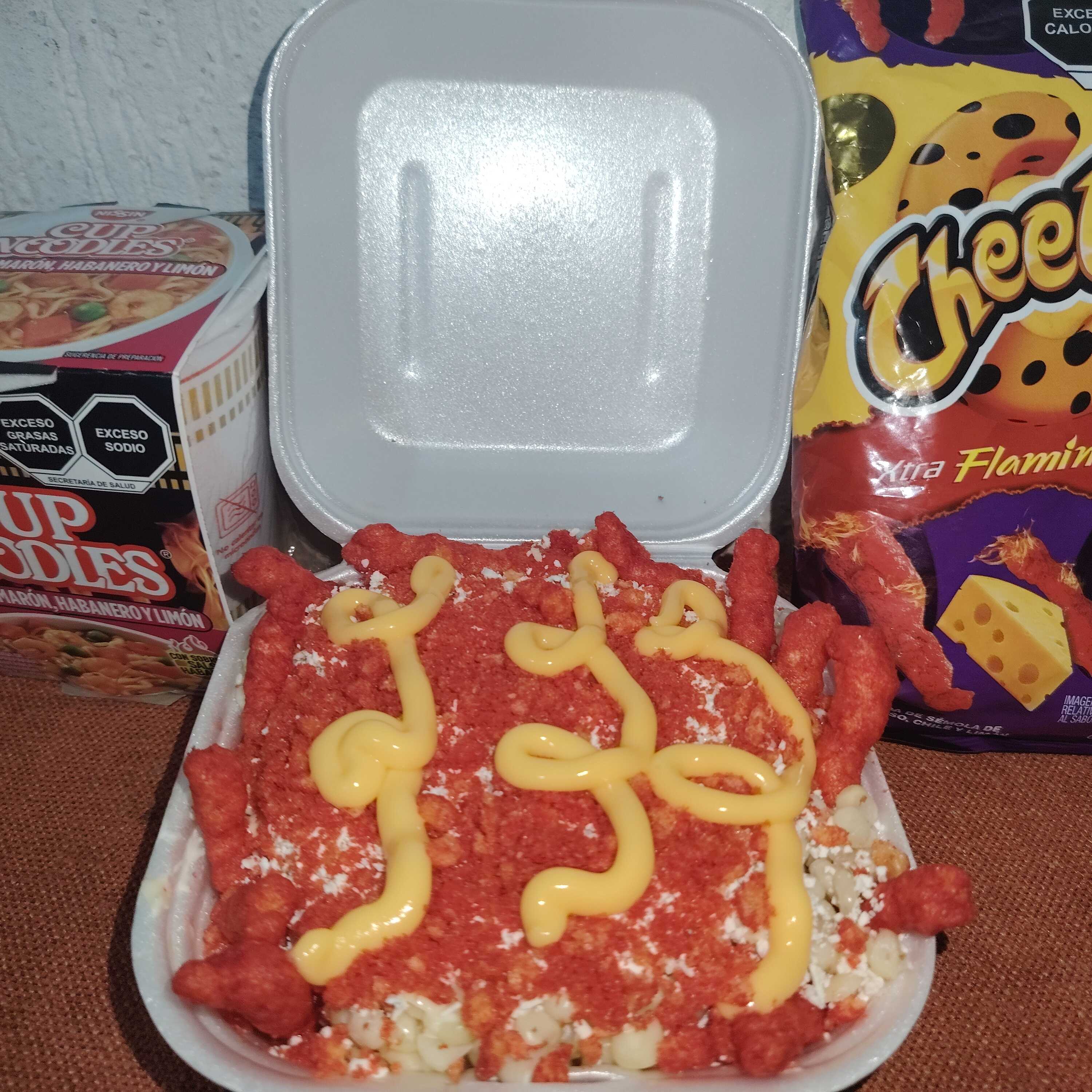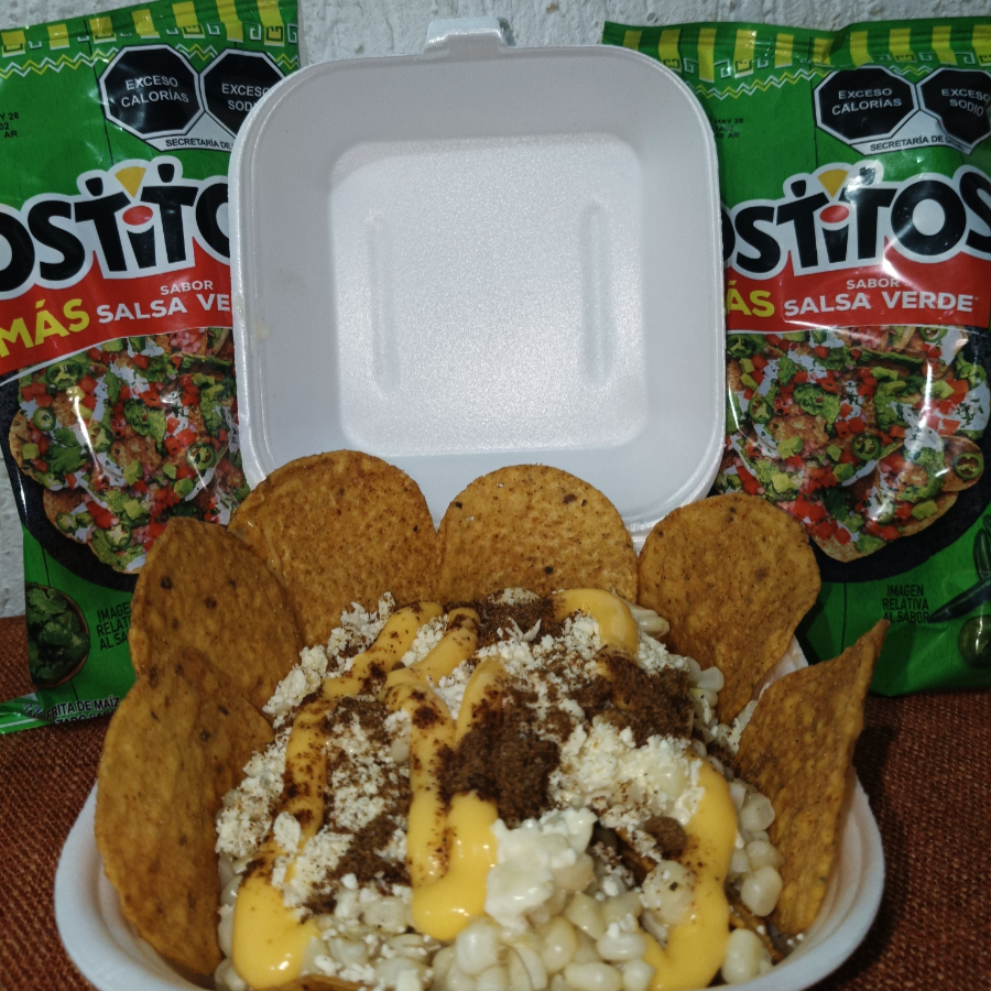 Tostitos flaming hot, elote, sal y limón, mayonesa queso cotija y queso amarillo, chile