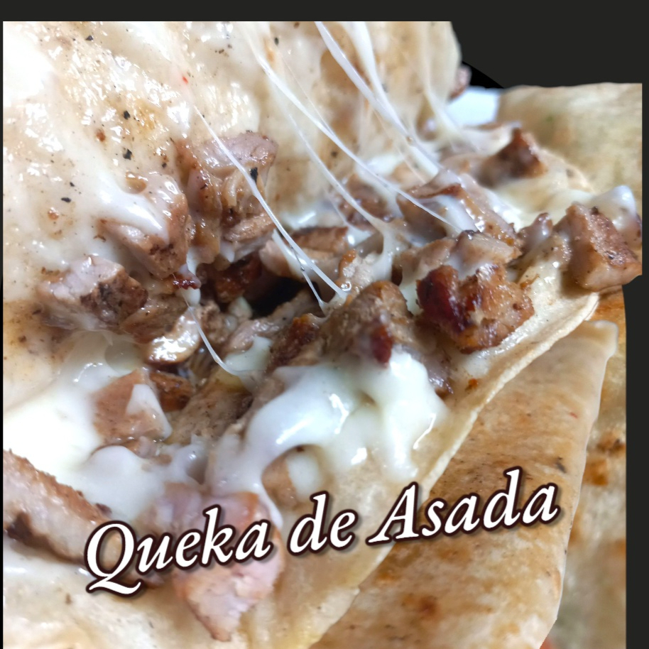 Tortilla frita alargada,base de frijol,carne asada adobada,col y cilantro,queso,cebolla encurtida y aguacate, salsa y picante