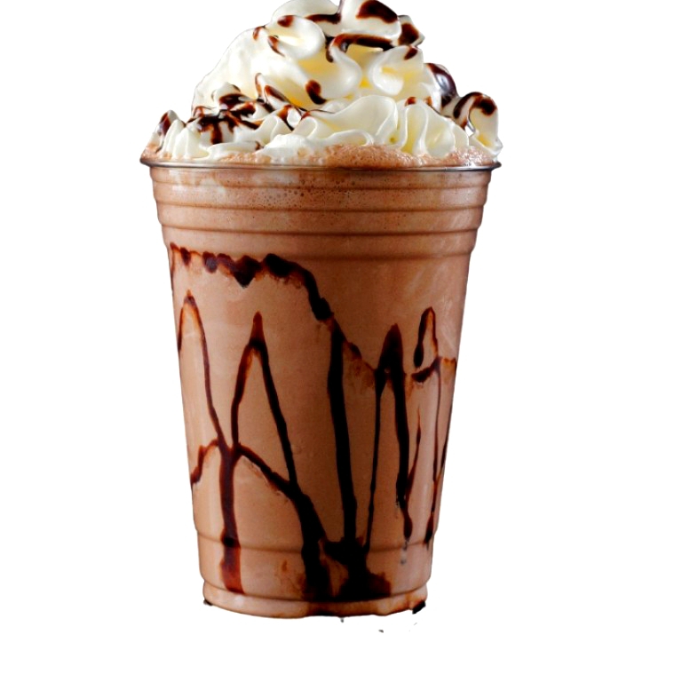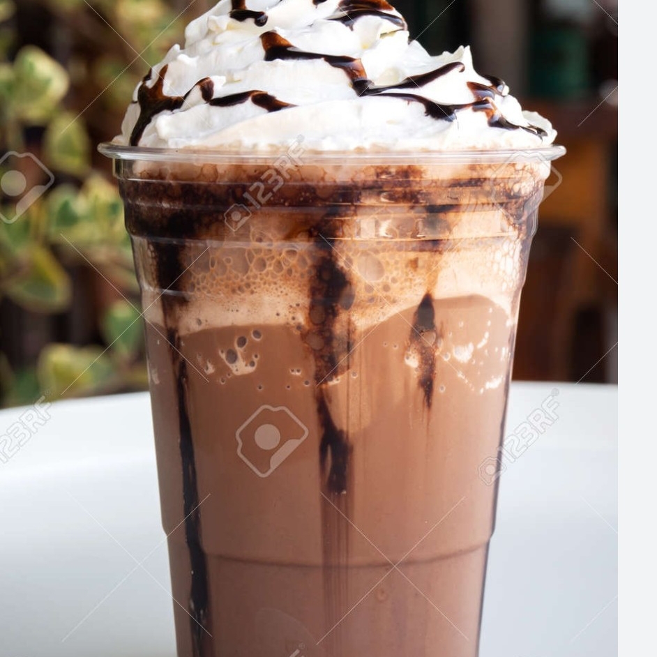 hielo ,leche , chocolate decorado con crema batida y salsa de chocolate