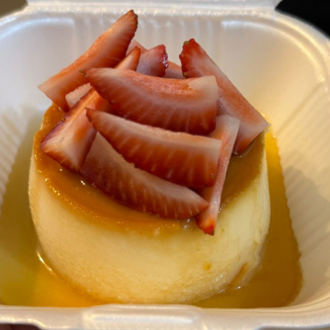 DELICIOSO FLAN NAPOLITANO, ACOMPAÑADO DE RICAS FRESAS FRESCAS