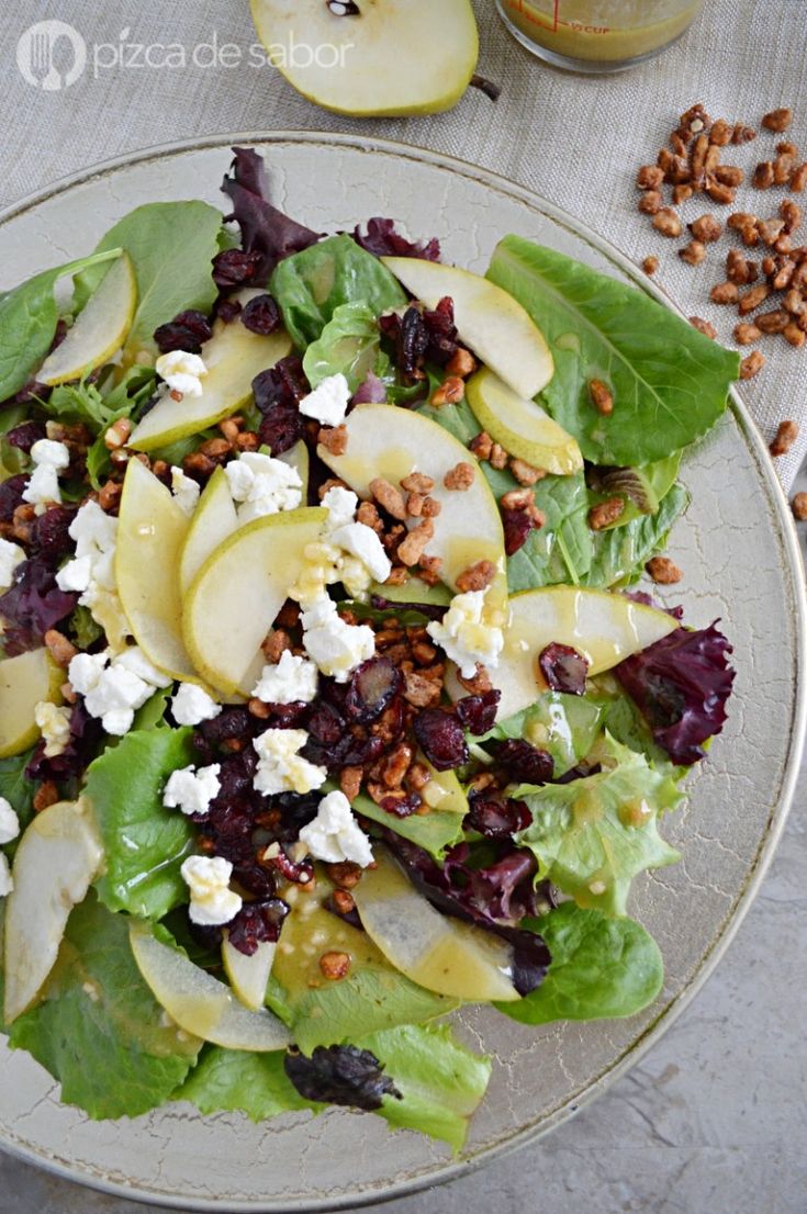 Espinaca, pera, arándanos, nuez pecana, queso de cabra,vinagreta miel mostaza.