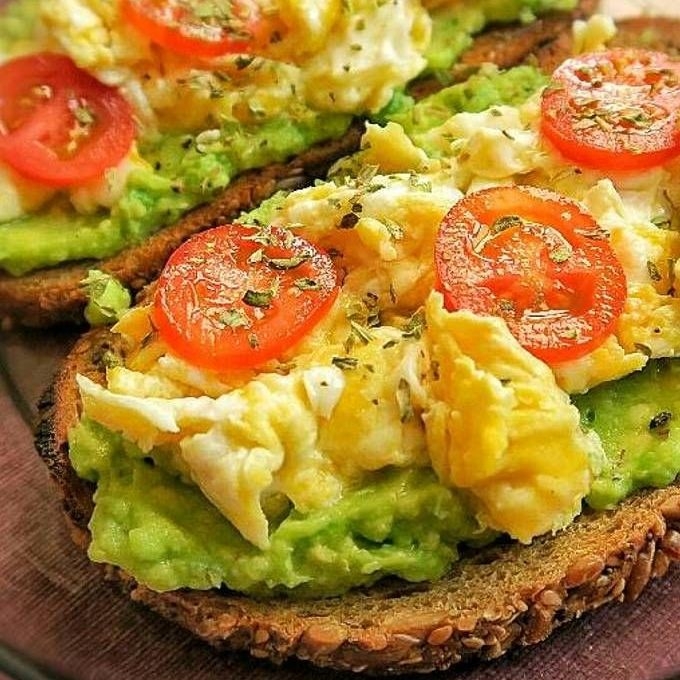 Pan de masa madre, huevo revuelto, queso crema, aguacate, peperoncino.