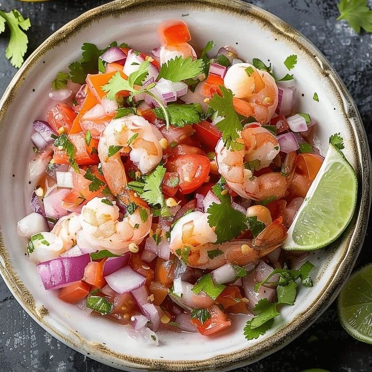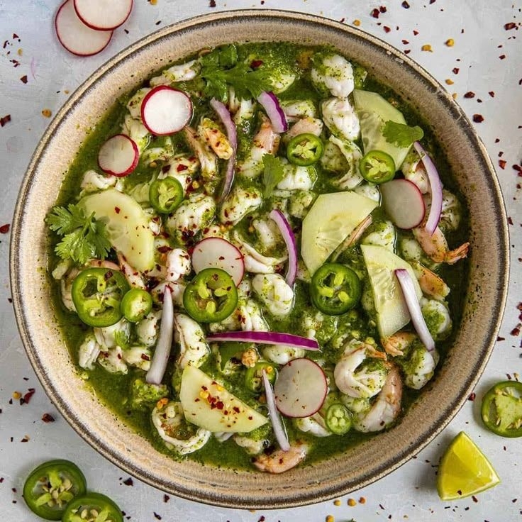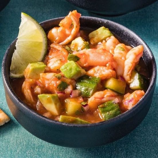 Preparado con camarón, pepino, aguacate, cebolla morada, serrano.