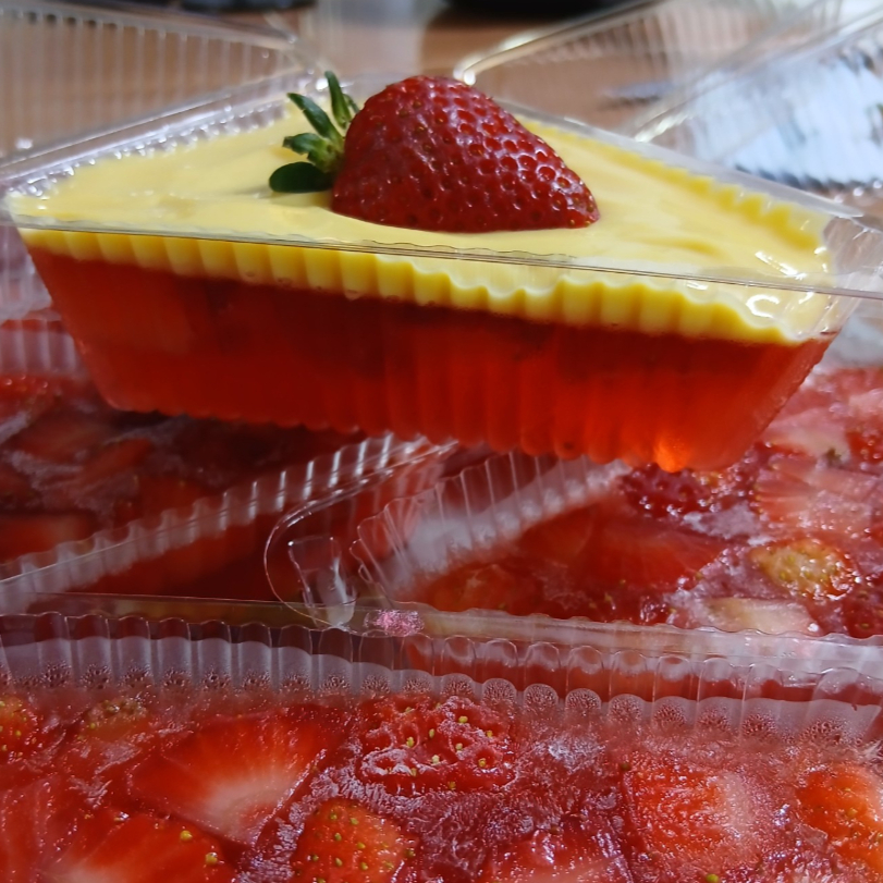 Gelatina sabor a Fresa con trocitos de la fruta, cubierta de crema pastelera y fruta nat.
