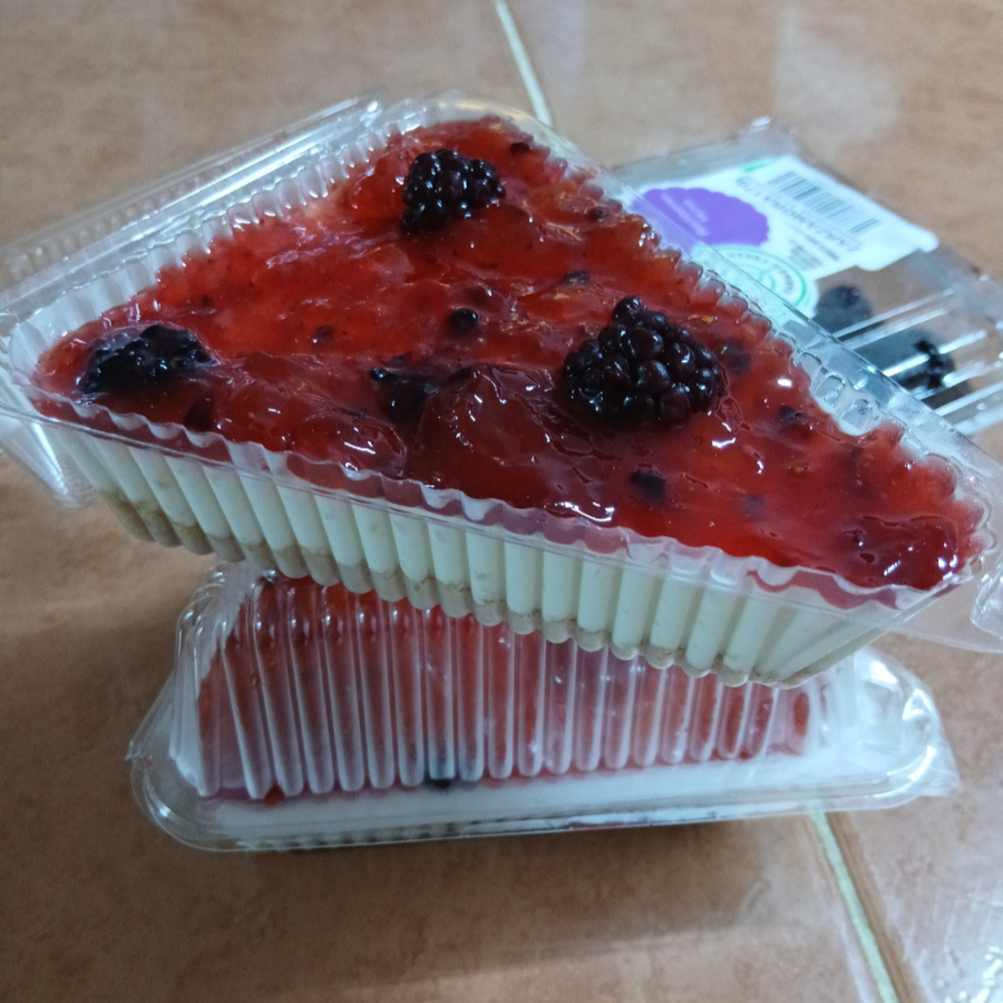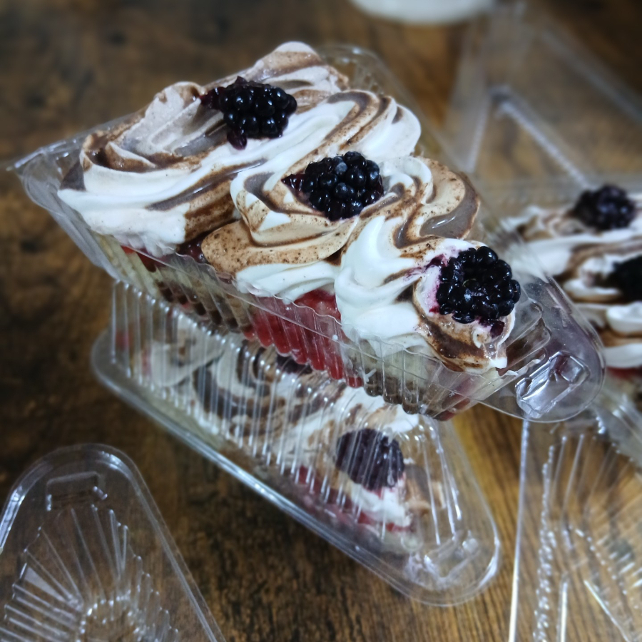 Mini Pastel 3 Leches, cubierto con mermelada de Frutos Rojos, Crema y Topping de Chocolate.