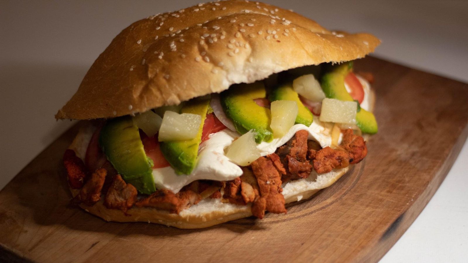 Torta grande de queso oaxaca, piña, salchicha y bistec de cerdo. Lleva aguacate jitomate cebolla mayonesa frijoles