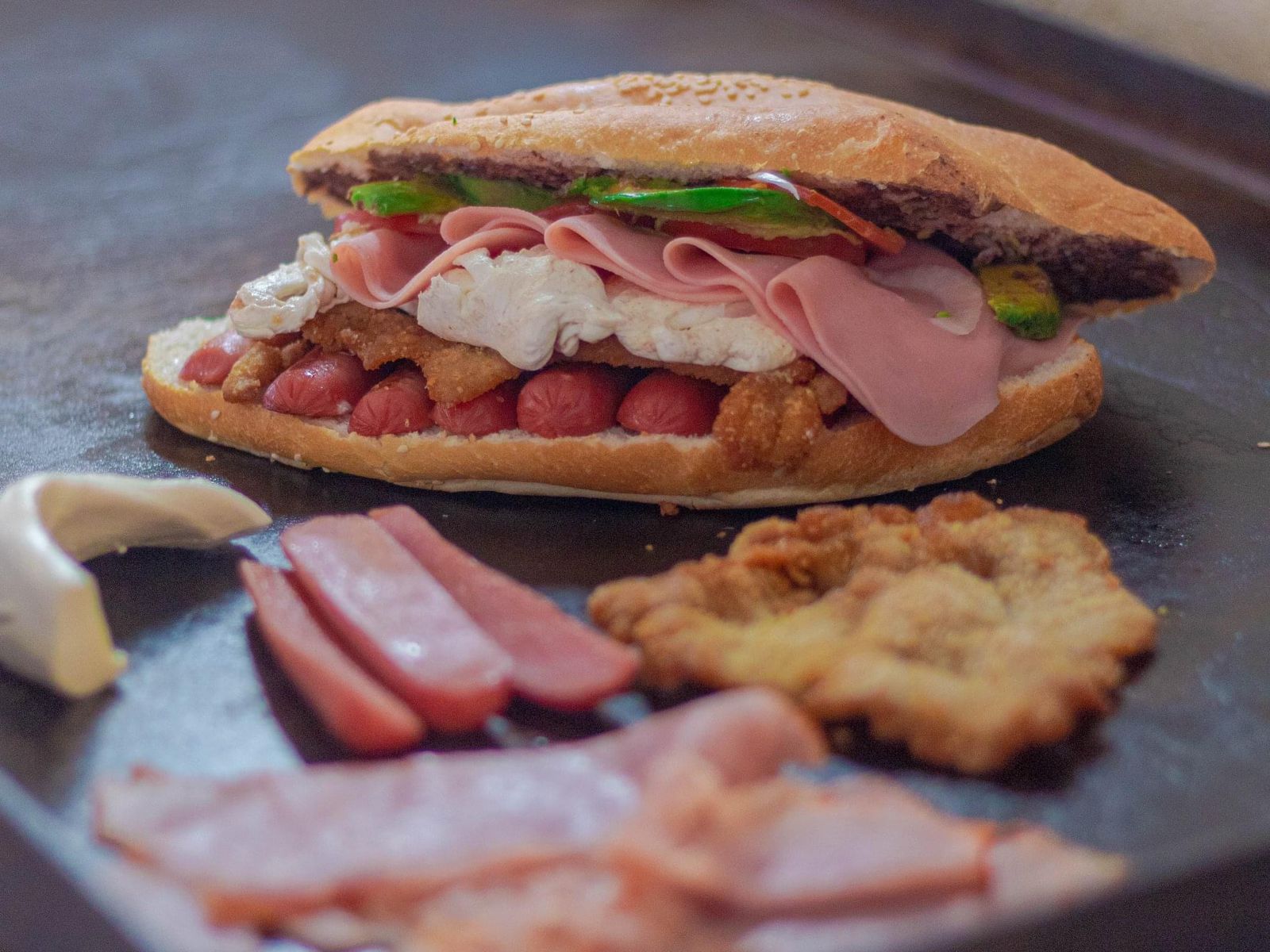Torta de jamón, chuleta, salchichón, quesillo. Lleva aguacate jitomate cebolla mayonesa y frijoles