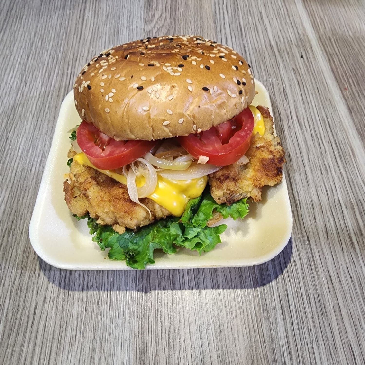 Pan parrillero con deliciosa pechuga de pollo empanizada, queso americano, lechuga, cebolla caramelizada, rodajas de jitomate, aderezo mil islas y bolsita de chile jalapeño.