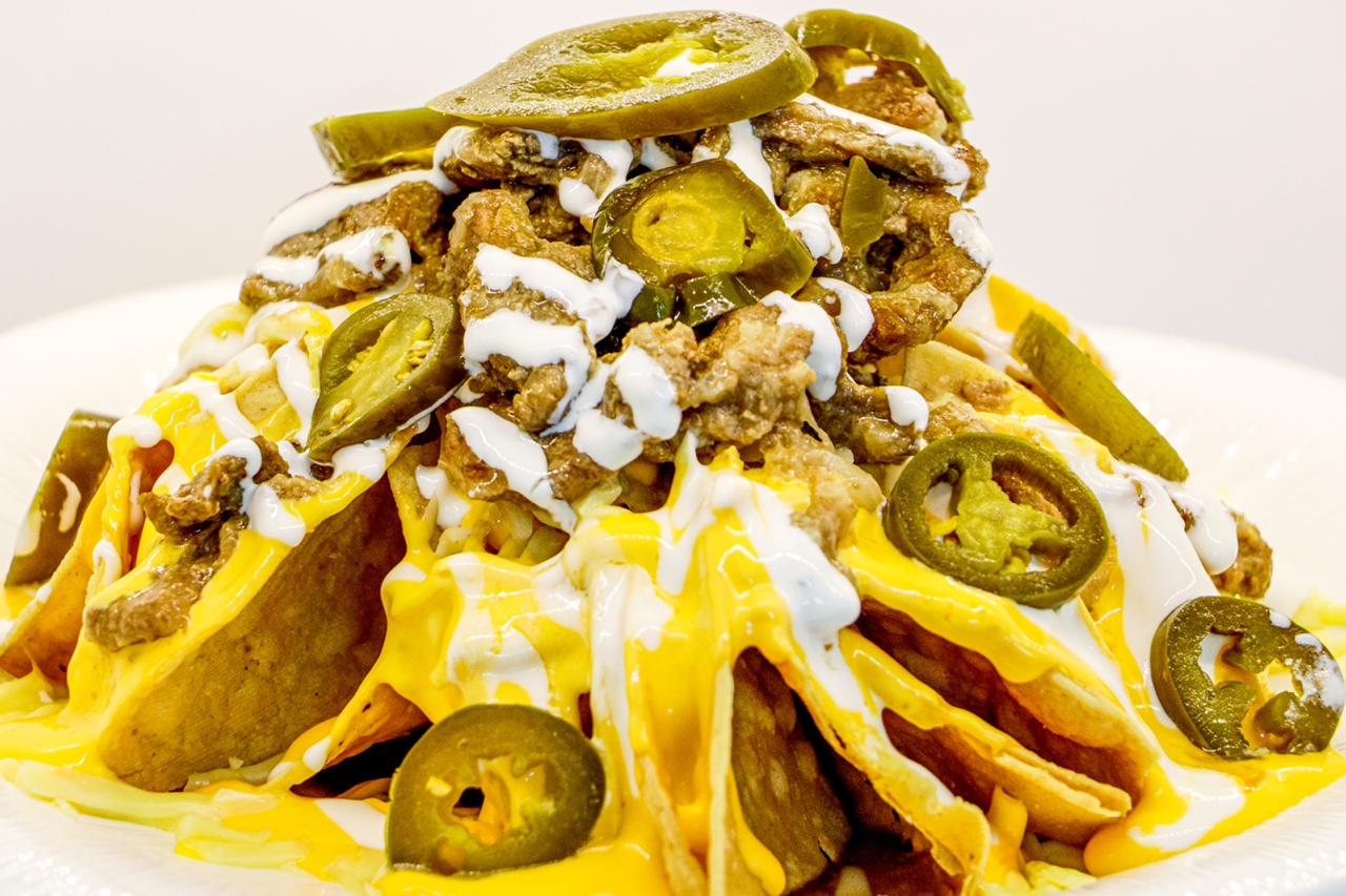 Base de frijoles, totopos, queso amarillo, queso manchego, proteína y jalapeños.