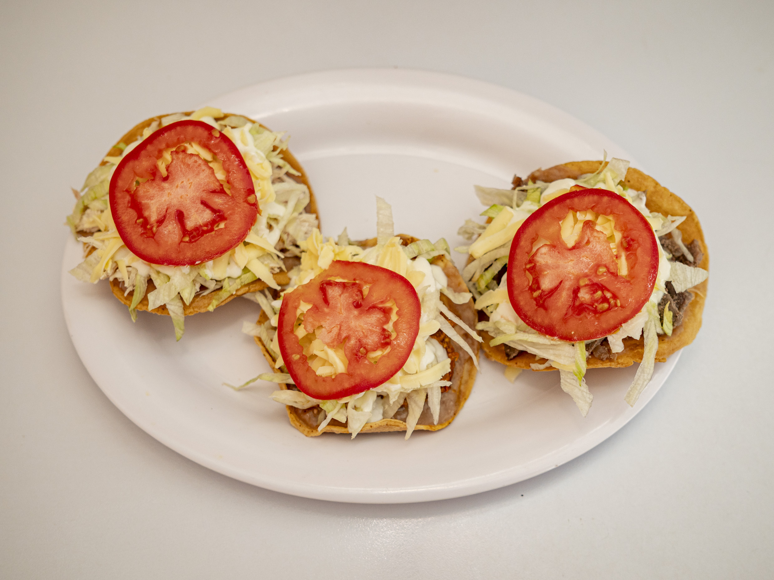 3 tostadas, base de frijoles, proteína, lechuga, tomate, queso y crema.