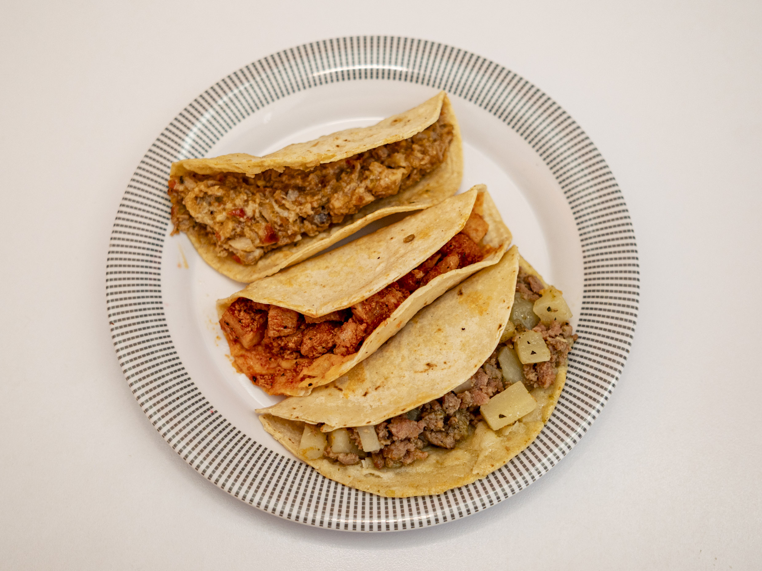 3 quesadillas de harina, guisado de elección.