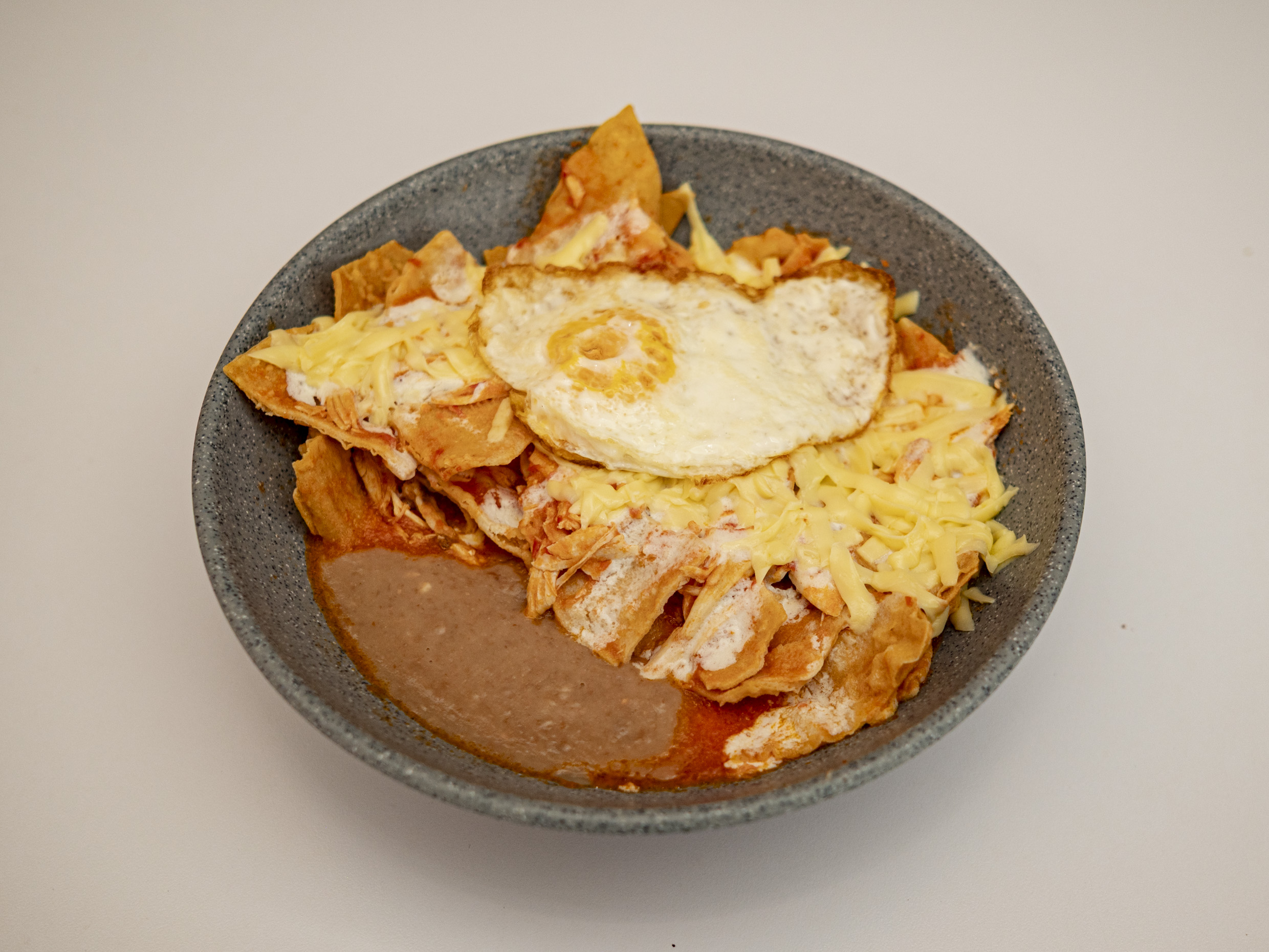 Totopos bañados en salsa verde, pollo, huevo, queso y crema, acompañado con frijoles.