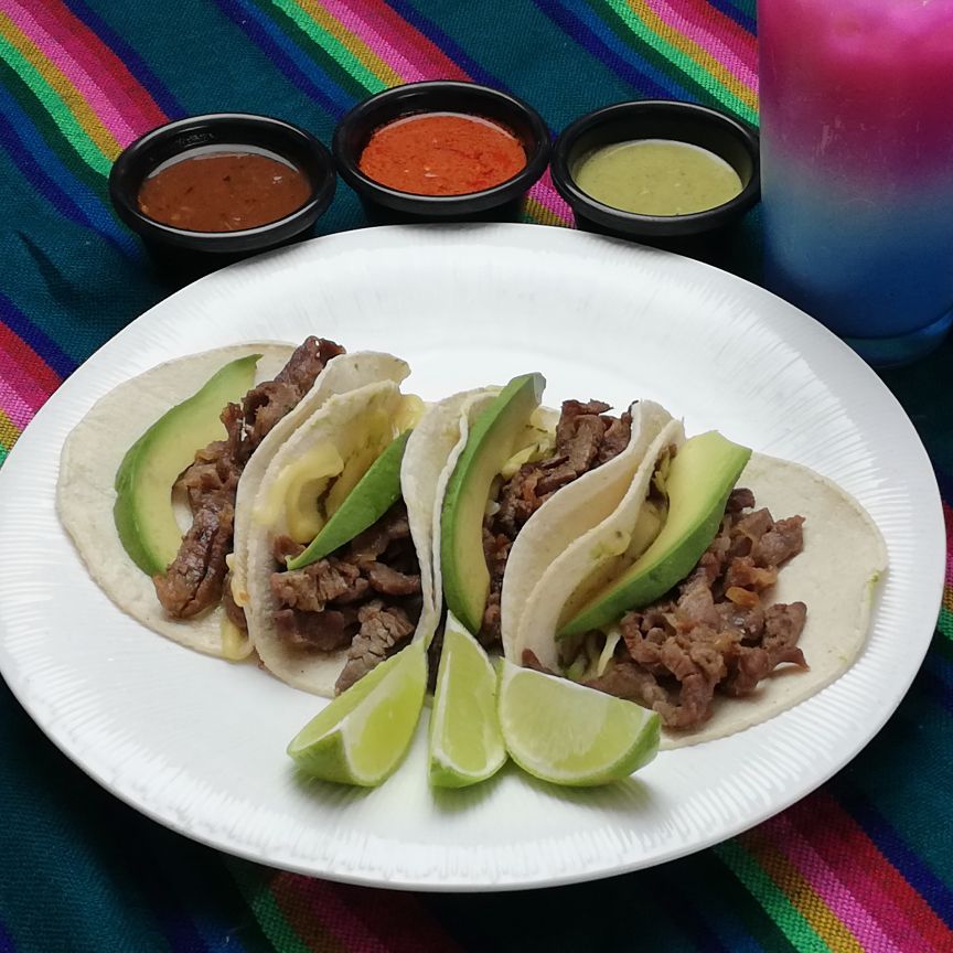 4 tacos de maíz de carne asada con cebolla salteada, queso y aguacate.