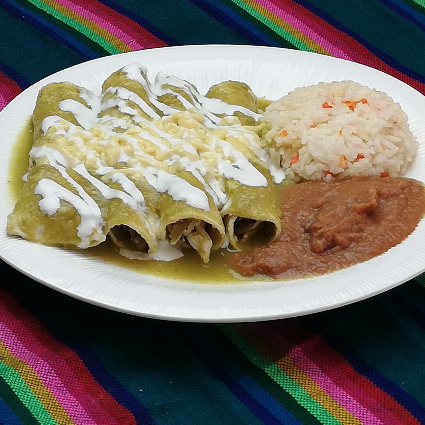 4 enchiladas verdes de pollo, acompañadas con frijoles y arroz.