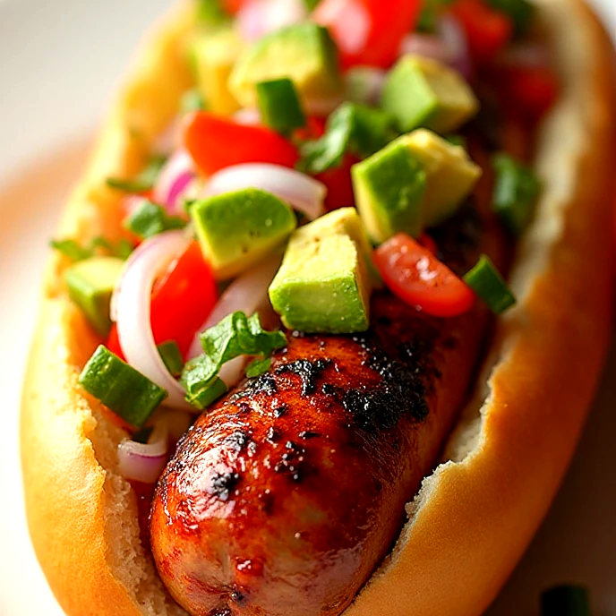 Salchicha 1/4 de libra de res al carbón, aguacate, tomate, cebolla, tocino, queso, cátsup, mostaza y mayonesa.