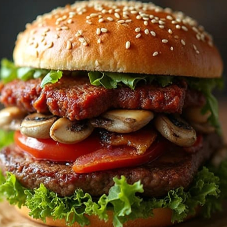 Rica hamburguesa de res, al carbón, champiñones salteados a la mantequilla, chorizo argentino, tocino, queso, lechuga italiana, tomate bola, cátsup, mostaza y mayonesa