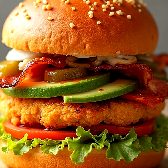 Pollo tempura y a la parrilla al calor del carbón, acompañada de aguacate, tocino, lechuga italiana, tomate bola, cebolla cruda, pepinillos , catsup, mostaza y mayonesa