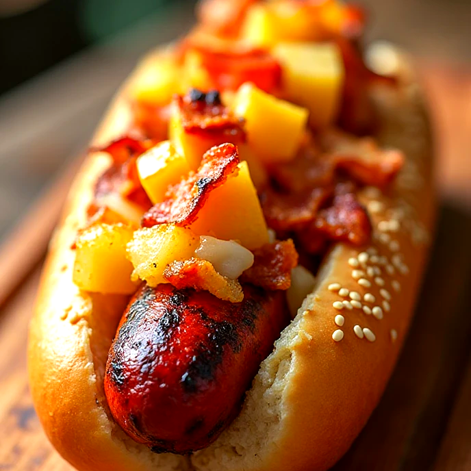 Salchicha JUMBO asada al carbón, tocino, queso, jamón y piña , opcional tomate y cebolla