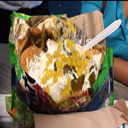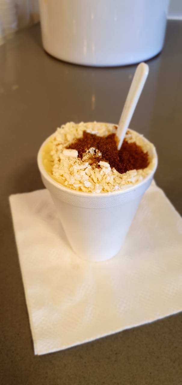 Esquite con grano de maíz, mantequilla, mayonesa y crema.