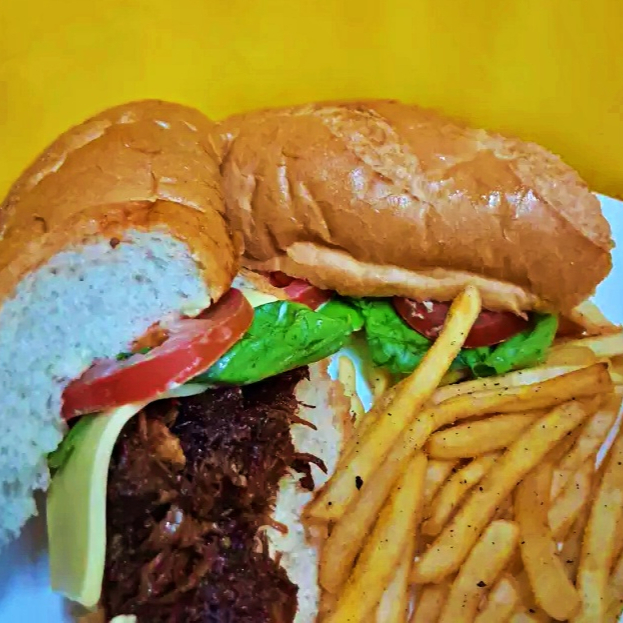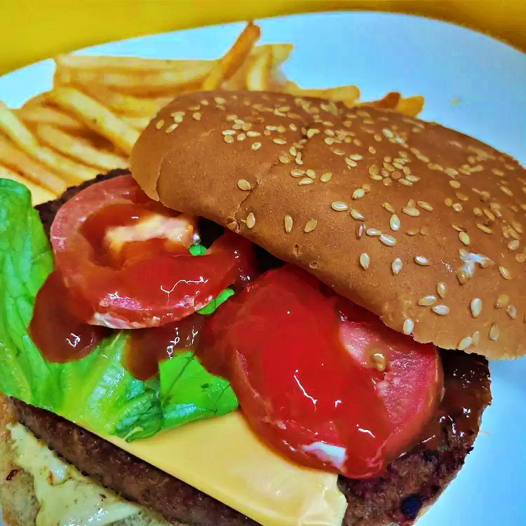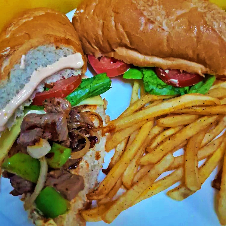 Carne de Sirloin, Queso Americano, Mayonesa, Tomate, Lechuga, Catsup, acompañada de papas fritas.