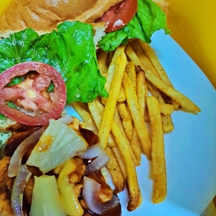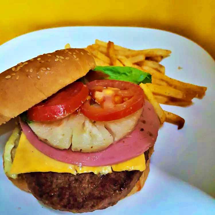 Carne de Sirloin, Jamón, Queso Americano, Piña caramelizada, Tomate, Lechuga, Mayonesa, Catsup, acompañada de papas fritas.