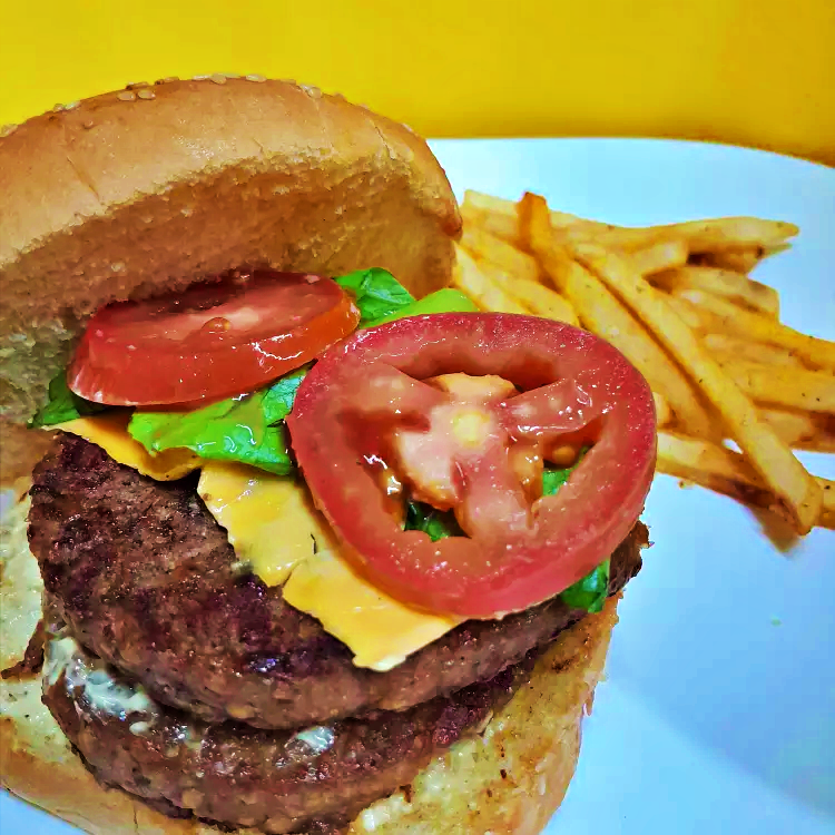 Doble Carne Sirloin, Queso Americano, Mayonesa, Tomate, Lechuga, acompañada de papas fritas