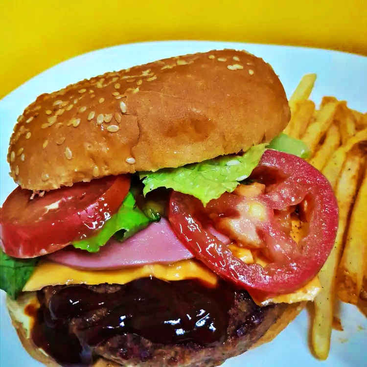 Carne de Sirloin, Jamón, Queso Americano, Salsa BBQ Chipotle, Tomate, Lechuga, Mayonesa, Catsup, acompañada de papas fritas.