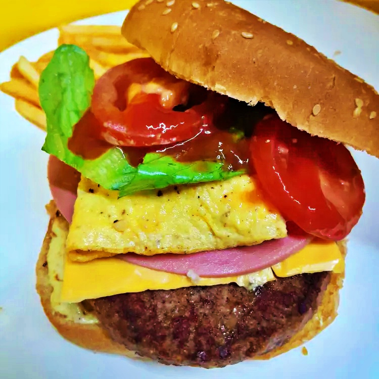 Carne de Sirloin, Jamón, Queso Americano, Huevo Frito, Tomate, Lechuga, Catsup, Mayonesa, acompañada de papas fritas.