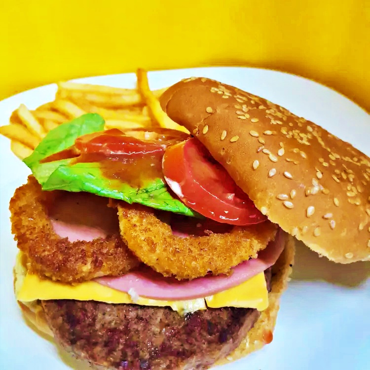 Carne de Sirloin, Jamón, Queso Americano, Aros de cebolla, Mayonesa, Tomate. Lechuga, Catsup, acompañada de papas fritas.