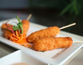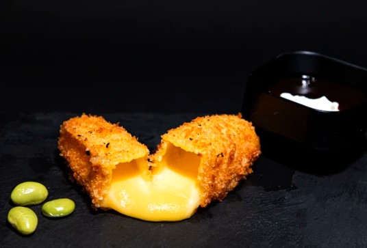 camaron empanizado , queso philadelphia y tampico. por fuera envuelto en agucate