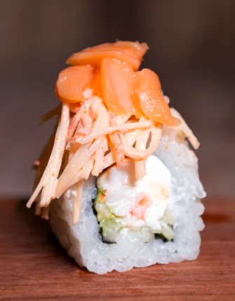 Salmon , queso philadelphia y pepino y por fuera aguacate topping cangrejo spicy