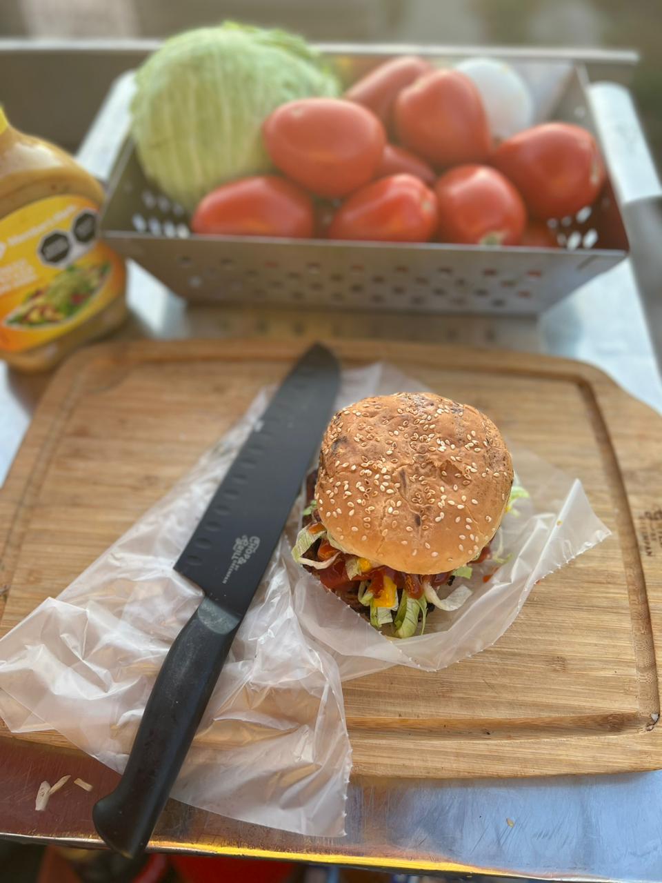 2 carnes de res, jitomate, cebolla, lechuga, jalapeño, cátsup y mostaza