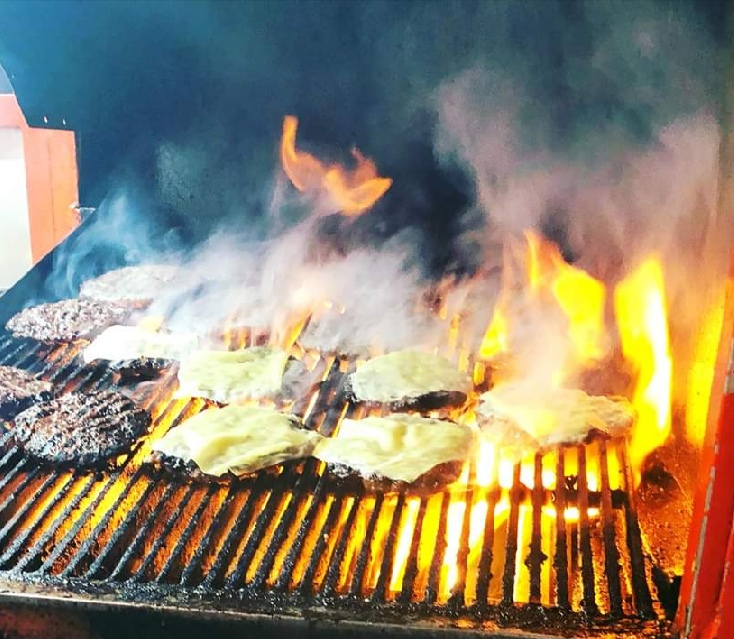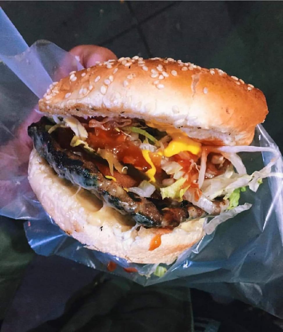 1 Carne de Res de 120gr aproximadamente, 1 Rebanada de Queso manchego, Jitomate, Cebolla, Lechuga, Jalapeño, Cátsup y Mostaza.