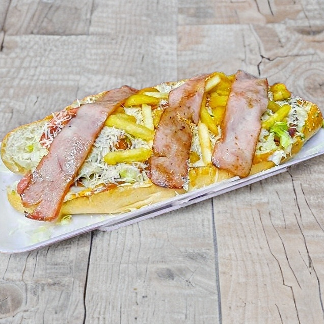 Salchicha de pavo, jamón, queso, tocino, cebolla, lechuga, queso parmesano, chile jalapeño y salsa cátsup.
