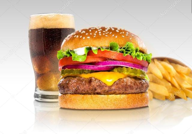 Hamburguesa doble carne, papas fritas.