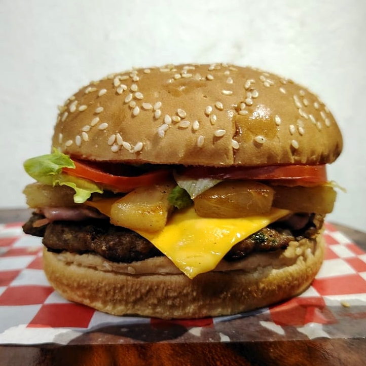 Hamburguesa con carne de res casera, jamón, queso americano, piña, lechuga, jitomate, jalapeños y pepinillos