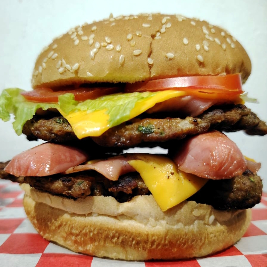 Hamburguesa especial con doble carne de res casera, doble jamón, doble queso americano, tocino, salchicha, lechuga, jitomate, jalapeños y pepinillos
